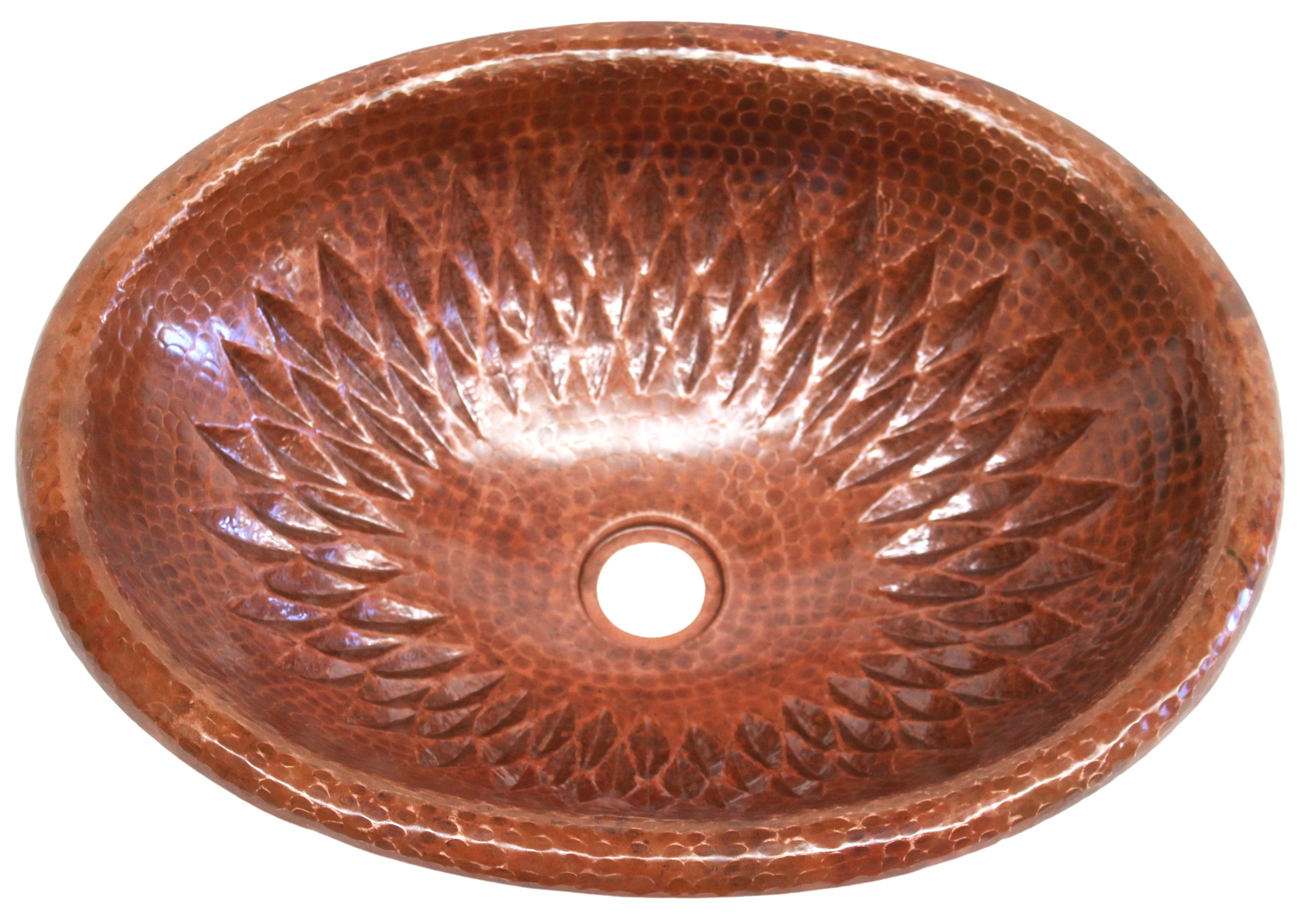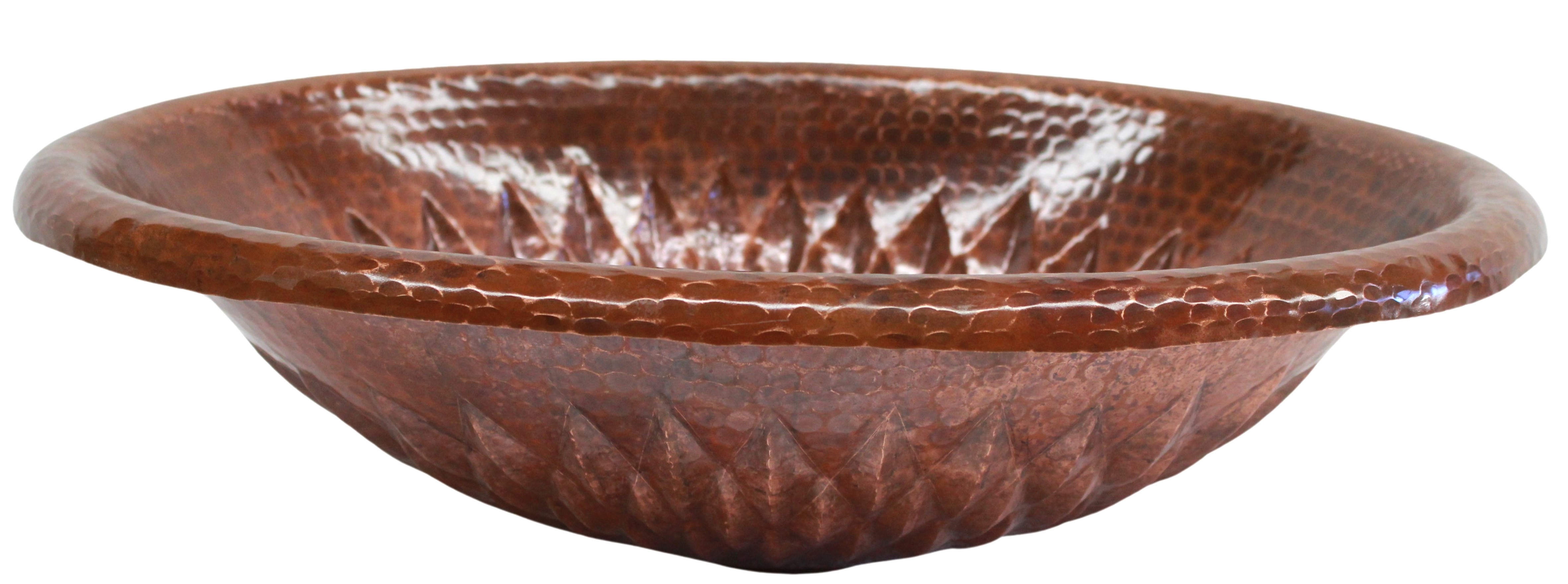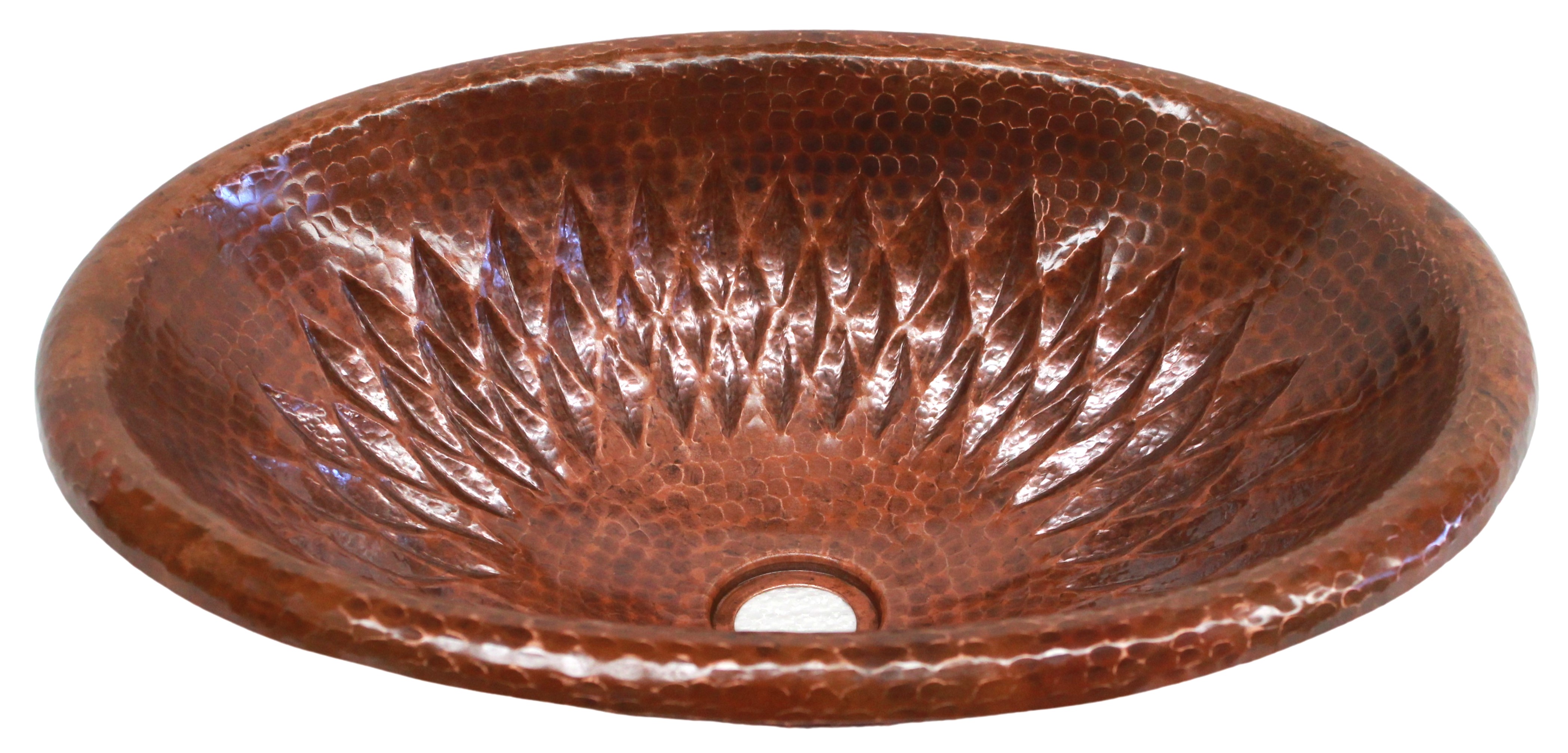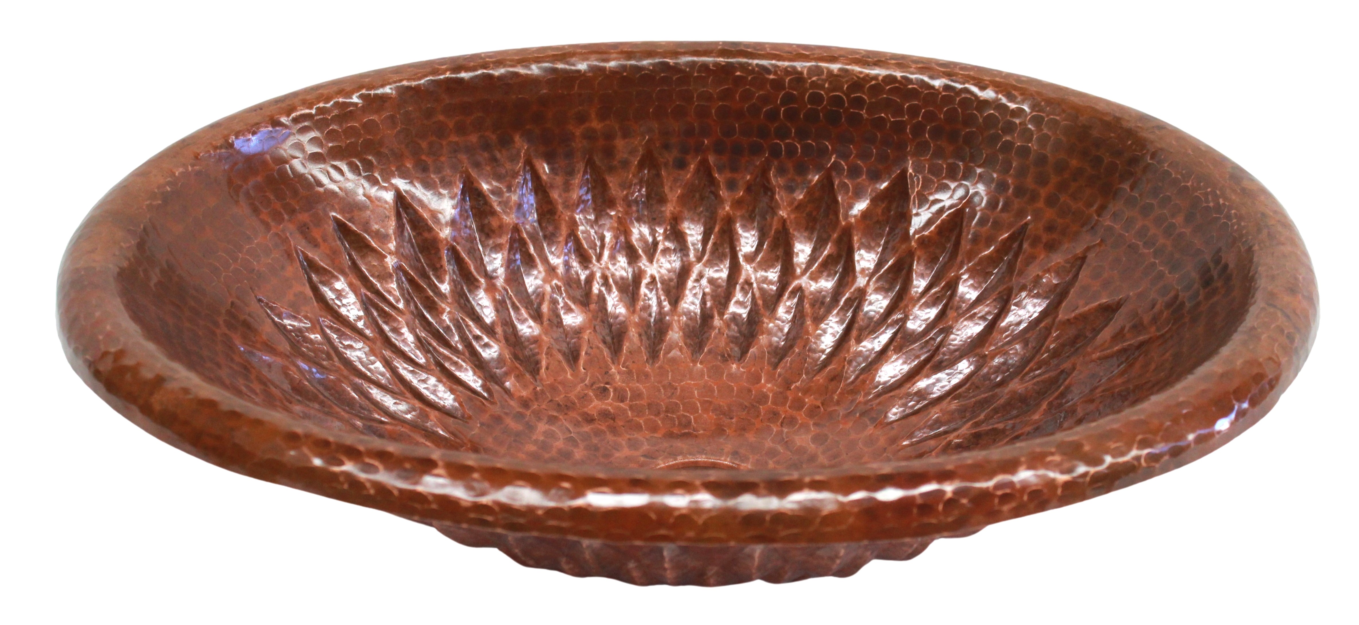 Beautiful Hand Hammered Copper Sink Oval in a Special ‘Cornflower’ Design. Available in 16″ x W 13″ x D 5″ and 19″ x W 15″ x D 6″ diameter. Or we can customize any size. Please check our information tabs below for more details.